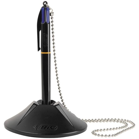 Automatyczny długopis na łańcuszku. Zawiera 4 niebieskie wkłady. Stabilna, obciążona podstawa i wytrzymały łańcuszek.