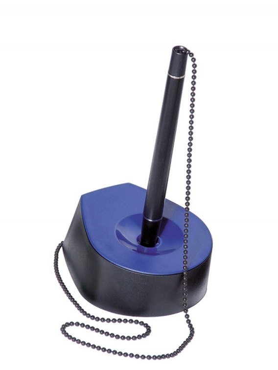 Długopis na łańcuszku, tusz na bazie oleju_wykonany z trwałego polistyrenu_stabilna, specjalnie dociążona podstawa_średnica kulki: 1mm_grubość linii pisania: ok. 0,47-0,50mm_długość linii pisania: ok. 3000m_długość łańcuszka: 55cm_średnica otworu: 11,4mm_wymiary podstawy: 68x95x40mm_kolor wkładu czarny_kolor czarno-niebieski