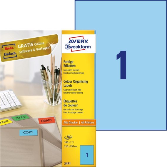 Etykiety AVERY ZWECKFORM trwałe kolorowe A4, 100 ark./op., 210 x 297 mm, niebieskie |