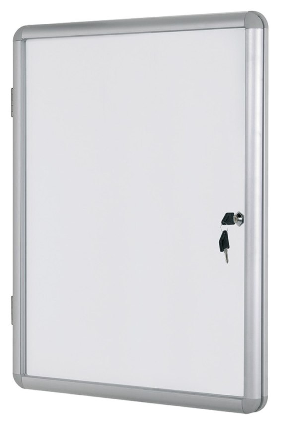 Gablota z powierzchnią suchościeralno-magnetyczną_do użytku wewnętrznego_mocowanie notatek za pomocą magnesów_zamykana na kluczyk_owalna, wąska rama wykonana z anodowanego aluminium_trwała witryna z mocnego tworzywa akrylowego, zapewnia doskonałą przejrzystość_w komplecie 2 klucze oraz zestaw mocujący do ściany_rozmiar tablicy: 90x120cm_głębokość wewnętrzna: 1,8cm_pojemność: 15 dokumentów w formacie A4_produkt pakowany jednostkowo w karton ochronny_kolor biały