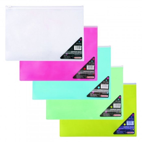 Koperta wykonana z bezbarwnego lub kolorowego polipropylenu. Zamykana na bezbarwny zamek strunowy. Wymiary: 340 x 238 mm