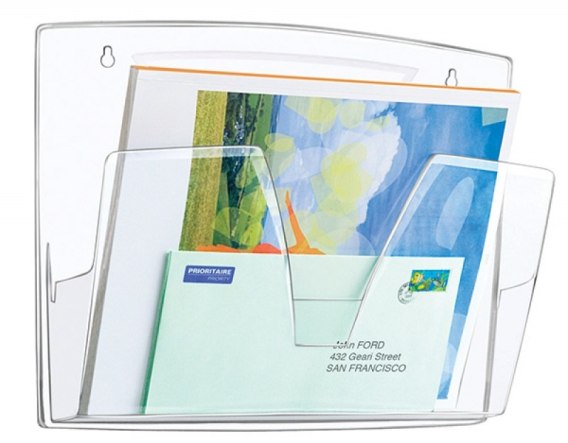 Zestaw półek przeznaczony na dokumenty w formacie A4, wykonany z odpornego na pęknięcia i odkształcenia polistyrenu_wewnątrz mieści ok. 300 kartek o gramaturze 80gsm o maksymalnym rozmiarze 24x32cm_duży kąt w kształcie litery V ułatwia wkładanie i wyjmowanie dokumentów_możliwość przechowywania większych formatów lub zrolowanych dokumentów (max. średnica 120mm)_mocowany za pomocą dwóch śrub - akcesoria do prostego i szybkiego montażu w komplecie_każdą półkę można zamontować oddzielnie_wymiary: 361x86x270mm_kolor przeźroczysty