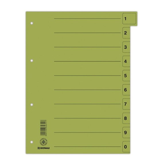 Wykonane z grubego kartonu o gramaturze 250gsm uzyskanego na drodze recyklingu_posiada Zielony Punkt (Der Gr_ne Punkt) - udział w systemie recyklingu i odzysku odpadów wynikający z przepisów prawa polskiego i UE_posiada certyfikat Blauer Engel_indeksy z mikroperforacją umożliwiającą łatwe i szybkie dostosowanie przekładki do indywidualnych potrzeb bez użycia nożyczek_ilość przekładek: 10_pierwsza karta opisowa z numerami_dziurkowanie: 4_format: A4_rozmiar przekładki: 235x300mm_kolor zielony