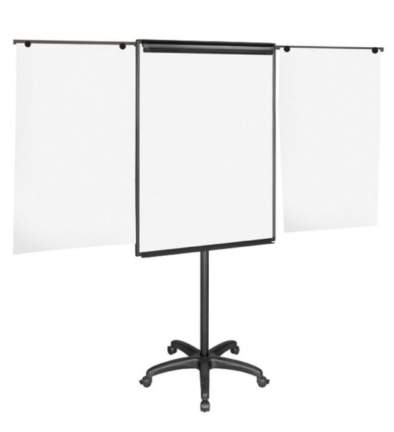 Flipchart z tablicą najwyższej jakości o powierzchni suchościeralno-magnetycznej mobilny - posiada 5 kółek umożliwiających szybkie przemieszczanie, z blokadą wyjątkowo łatwy w użytkowaniu dzięki zastosowanym technologiom wąska rama wykonana z wytrzymałego