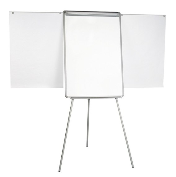 Flipchart z tablicą o powierzchni suchościeralno-magnetycznej_stabilna, lekka konstrukcja z trójnogiem_wąska, aluminiowa rama_regulowana wysokość_wyposażony w plastikową półkę_unoszony zacisk umożliwia łatwą i sprawną wymianę bloku_wyciągane ramiona umożliwiają zawieszenie bloków_zapewnia dobry kontrast kolorów_produkt pakowany jednostkowo w karton ochronny_rozmiar tablicy: 70x100cm_rozmiar flipcharta ze stelażem: 70x195cm