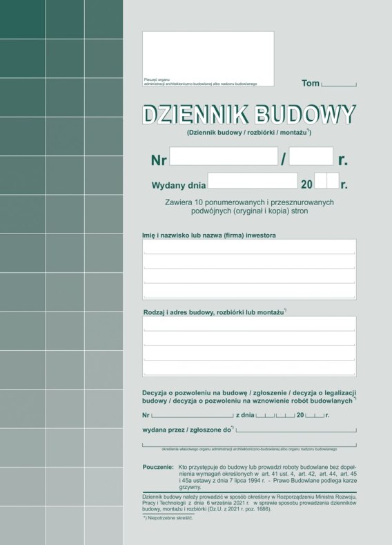 603-S11 Dziennik Budowy A4, 20str. (10 kompletów oryginał+kopia) samokopia Michalczyk i Prokop