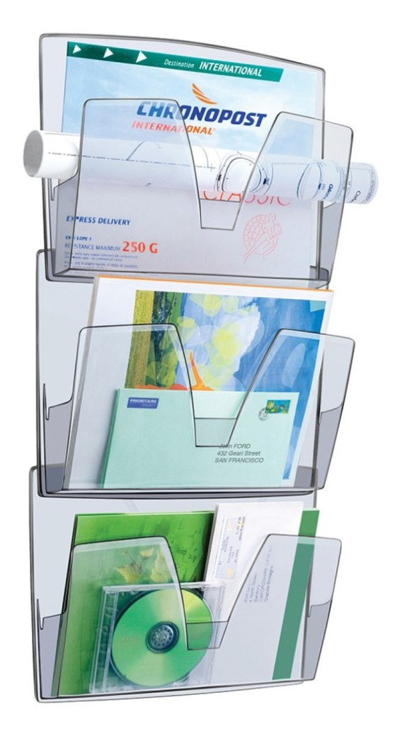 Zestaw półek przeznaczony na dokumenty w formacie A4, wykonany z odpornego na pęknięcia i odkształcenia polistyrenu_wewnątrz mieści ok. 300 kartek o gramaturze 80gsm o maksymalnym rozmiarze 24x32cm_duży kąt w kształcie litery V ułatwia wkładanie i wyjmowanie dokumentów_możliwość przechowywania większych formatów lub zrolowanych dokumentów (max. średnica 120mm)_mocowany za pomocą dwóch śrub - akcesoria do prostego i szybkiego montażu w komplecie_każdą półkę można zamontować oddzielnie_wymiary: 361x86x270mm_kolor dymny