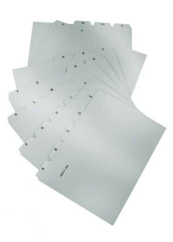 Wykonane z PP, przeznaczone do kartotek A4_do oddzielania kart umieszczonych poziomo_ilość przekładek: 25_indeks: A-Z_kolor szary