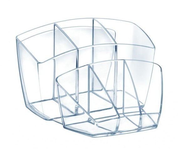 Elegancki przybornik na biurko o opływowym kształcie i zaokrąglonych rogach_wyposażony w 8 przegródek: 3 przednie - małe przeznaczone na drobne akcesoria biurowe_3 tylne - duże przeznaczone na artykuły piśmienne_1 przeznaczona na karteczki, bloczki, wizytówki_1 tylna przeznaczona na płyty CD, DVD, koperty_gumowe podkładki chronią blat biurka przed zarysowaniem i stanowią zabezpieczenie antypoślizgowe_wykonany z odpornego na pęknięcia polistyrenu _wymiary: 143x158x93mm