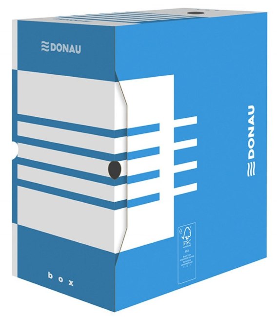 Wykonane z trójwarstwowej tektury falistej o gramaturze 390gsm_produkt bezkwasowy (pH ok. 7,5)_typ fali: B_szerokość grzbietu: 155mm_pojemność: do 1550 kartek o gramaturze 80gsm_mieści 2 segregatory A4/75mm, wysokość pudła dopasowana do wysokości segregatora_posiada 5 otworów ułatwiających wkładanie/wyjmowanie oraz 5 ścian opisowych_pasuje do wszystkich pudeł zbiorczych Donau_możliwość stawiania na krótszym lub dłuższym boku_certyfikat FSC_ gwarantuje, że surowiec potrzebny do produkcji wyrobu pochodzi z lasów zarządzanych w odpowiedzialny sposób; promuje on trwałą gospodarkę leśną opartą o najwyższe światowe standardy w dziedzinie ochrony przyrody i gwarantuje legalność pochodzenia surowca_format: A4_wymiary: 155x340x297mm_kolor niebieski