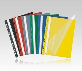 Przednia okładka przezroczysta twarda, druga kolorowa. Wykonany z mocnego i sztywnego PCV. Wyposażony w papierowy, wysuwany pasek do opisu. Po przeciwnych stronach grzbietu znajdują się dwa wycięcia ułatwiające wysuwanie paska. Zaokrąglone rogi obu okładek.