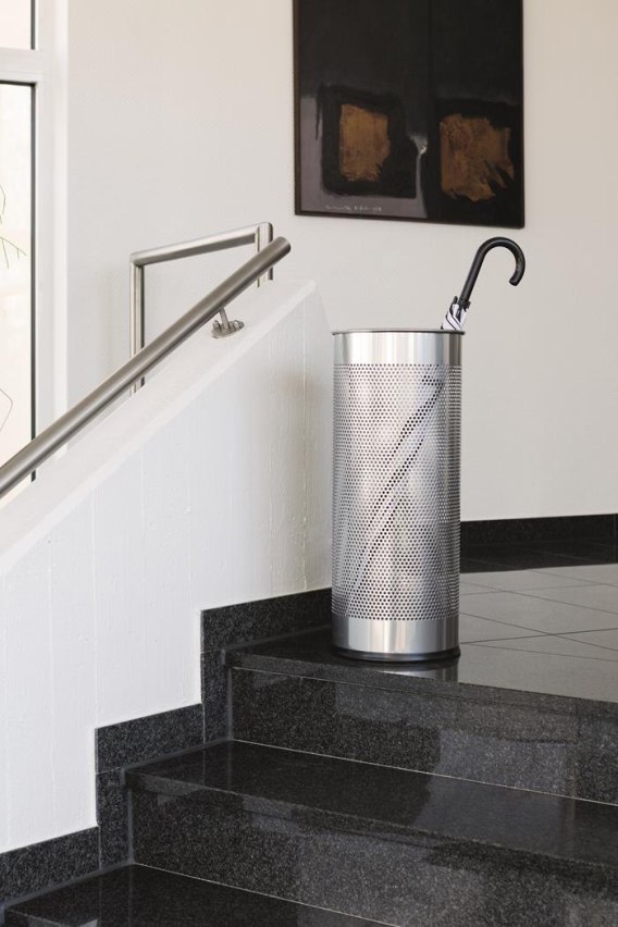 Stojak na parasole, metalowy, okrągły 28,5, kolor srebrny Durable_- Wysokiej jakości stojak na parasole z dekoracyjną perforacją. Wykonany z nierdzewnej stali. Idealny do pomieszczeń biurowych, hotelowych, sklepowych lub do domu. Pojemność 28,5 litra. Wymiary: (wys x przekątna) 620 x 260 mm. Kolory: czarny i srebrny_- jednostka sprzedaży 1 sztuka
