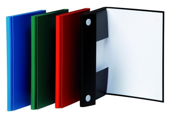 Wykonana z utwardzanego kartonu (1,8mm)_pokryta ekologiczną folią PP o grubości 100_m_wewnątrz biała okleina o gramaturze: 100g/m__zamykana na 2 rzepy_posiada 3 boczne skrzydła_pojemność: ok. 120 kartek o gramaturze 80g/m_