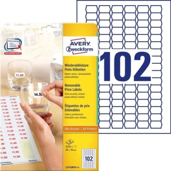 • Usuwalne etykiety cenowe, A4, 25 ark./op., 26 x 16 mm, białe, AVERY ZWECKFORM, L3410REV-25 Avery Zweckform
