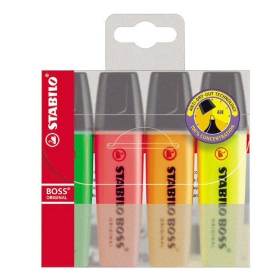 | Nazwa B2B | Zakreślacz STABILO BOSS, fluorescencyjny, 4 szt. w etui z wieszaczkiem |